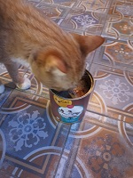 He can hardly wait until the organic duck is in the bowl... He devours the delicious duck with a satisfied purr and smacks his lips.